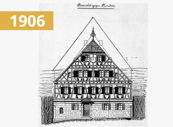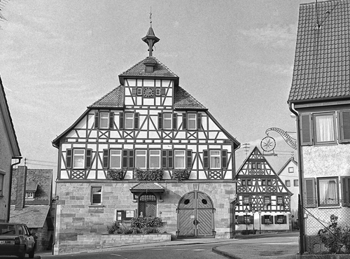 Das Rathaus ist nach seiner letzten Renovierung im Jahr 2006 wieder ein absolutes Schmuckstück unseres Ortes. Das Gebäude wurde 1591 erbaut, die Jahreszahl stand früher an der nordöstlichen Ecke über dem damaligen Pranger. Mit dem Rathaus zusammengebaut war früher die herrschaftliche Kelter, es war zunächst ein Gebäude mit 2 unterschiedlichen Giebelhöhen. Auf einer Lithographie von 1840 ist zu sehen, dass die Kelter hinten steht und niedriger ist, auf Plänen von 1906 ist die Giebelhöhe gerade anders herum gezeichnet.