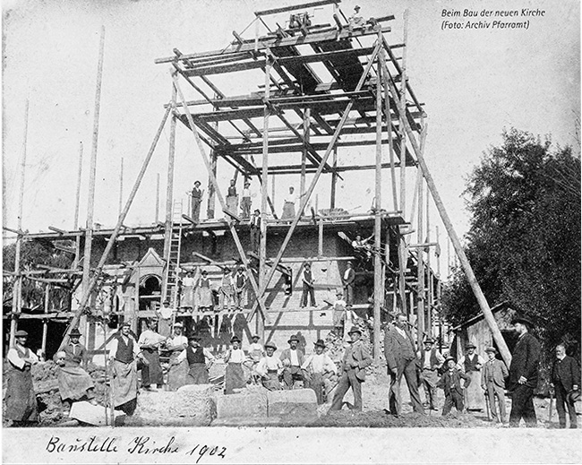 Die zunehmende Verwahrlosung der Laurentiuskirche, durch Feuchtigkeit des eindringenden Grundwassers, beschloßen der Kirchengemeinderat, der Gemeinderat und der Bürgerausschuss einstimmig den Entschluss zu einem Neubau zwischen dem Friedhof und der Orangerie des Schlossguts. Der Kirchenbau Architekt Heinrich Dolmetsch wählte den Baustil der Neoromanik. Am 06. August fand die Grundsteinlegung statt, hierzu fand sich beinahe die ganze Gemeine ein. Einweihung war am 23. August 1903 unter großer Anteilnahme der Bevölkerung und mit einem angemessenen Festprogramm die neue Kirche eingeweiht werden.